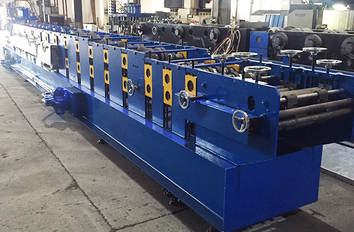 3、成型主机:机架用446H钢焊接而成,机组长度为9.85米,宽度为1.3米,高度为1.70米,整机重量为9吨,采用隔套式手动调节规格方式,轧制规格为宽度140-250mm,高度为50-80mm,压制板材质Q235,厚度为2-3mm,成型速度为20米/分,主机十四道滚压成型,轮子材料为Cr12优质合金钢,淬火硬度为HRC60-62,辊轴材料为Ф78圆45#优质碳素钢,经调质处理,硬度为HRC28~32。